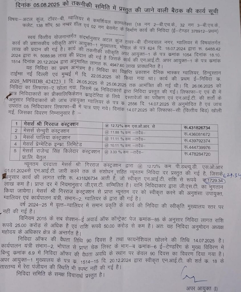 इसी तरह दीनदयाल नगर के अटल कुंज टावर, का MP e-tender No. 2025_MPHIDB_424223_1 में ठेकेदार श्री गिरराज कंस्ट्रक्शन ग्वालियर द्वारा निविदा डाली गई मंडल के सूत्र बताते हैं कि SOR से 12.72% कम दर रू. 43.18 करोड की स्वीकृति हेतु आयुक्त डॉ. राहुल हरिदास फटिंग और शैलेन्द्र वर्मा अपर आयुक्त-1 के साथ ठेकेदार से 2% टेण्डर स्वीकृति की दर से रू. 86.00 लाख लेने कमीशन लेने का मामला भी हाऊसिंग बोर्ड और ग्वालियर के चौक चौराहों पर जन चर्चा का विषय बना हुआ है।