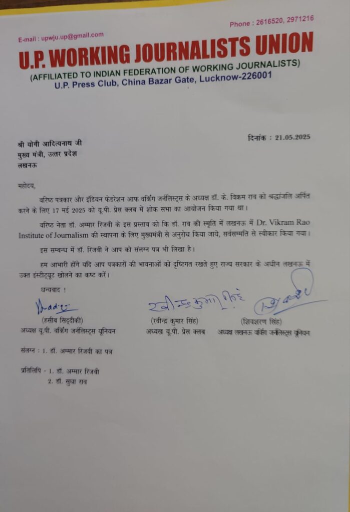वरिष्ठ नेता डॉ अम्मार रिजवी ने वरिष्ठ पत्रकार और इंडियन फेडरेशन ऑफ वर्किंग जर्नलिस्ट के अध्यक्ष डॉक्टर के विक्रम राव की स्मृति में लखनऊ में जर्नलिज्म इंस्टिट्यूट स्थापित करने के लिए मुख्यमंत्री को पत्र लिखा है ।
